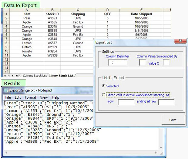 Export List can save a selected list of data in Excel to a file with the capabilities to surround each cell value with a defined character, as well as the capabilities to define the column delimiter.