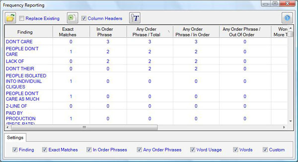 With the Frequency Reporting utility you can group word and phrase pattern frequency data for graphing and reporting in Excel. This utility is utilized in conjunction with the saved output of the Analyze Content utility.