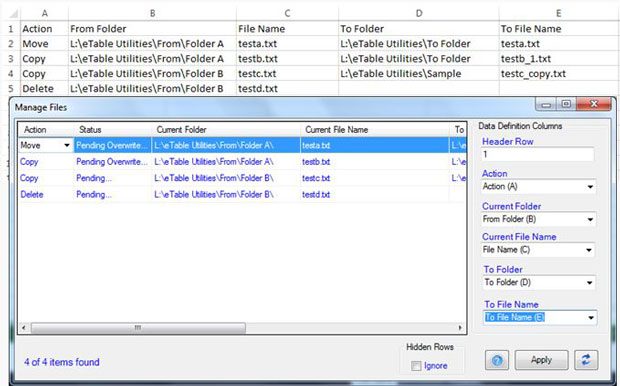 Header Row: The row that contains the column header names Action: The column that contains the Action to be performed (i.e. Move, Copy, Delete, or Ignore). The Action can also be defined (i.e. overridden) by selecting an action from the Action column drop down list within the result listing Current Folder: The column that contains the folder path of the file to be moved, copied, or deleted Current File Name: The column that contains the file name located within the defined From Folder To Folder: The column that contains the folder path to move or copy the file to To File Name: The column that contains the name of the file once it has been moved or copied to the defined To Folder Hidden Rows: Check ignore hidden rows when you want to ignore hidden rows within the defined Excel list of data. Rows hidden will not be added to the Manage Files list. ? Select the ? button when you want open your web browser to this utilitie's online documentation Apply Select the Apply button to perform the defined Action to each item within the list |